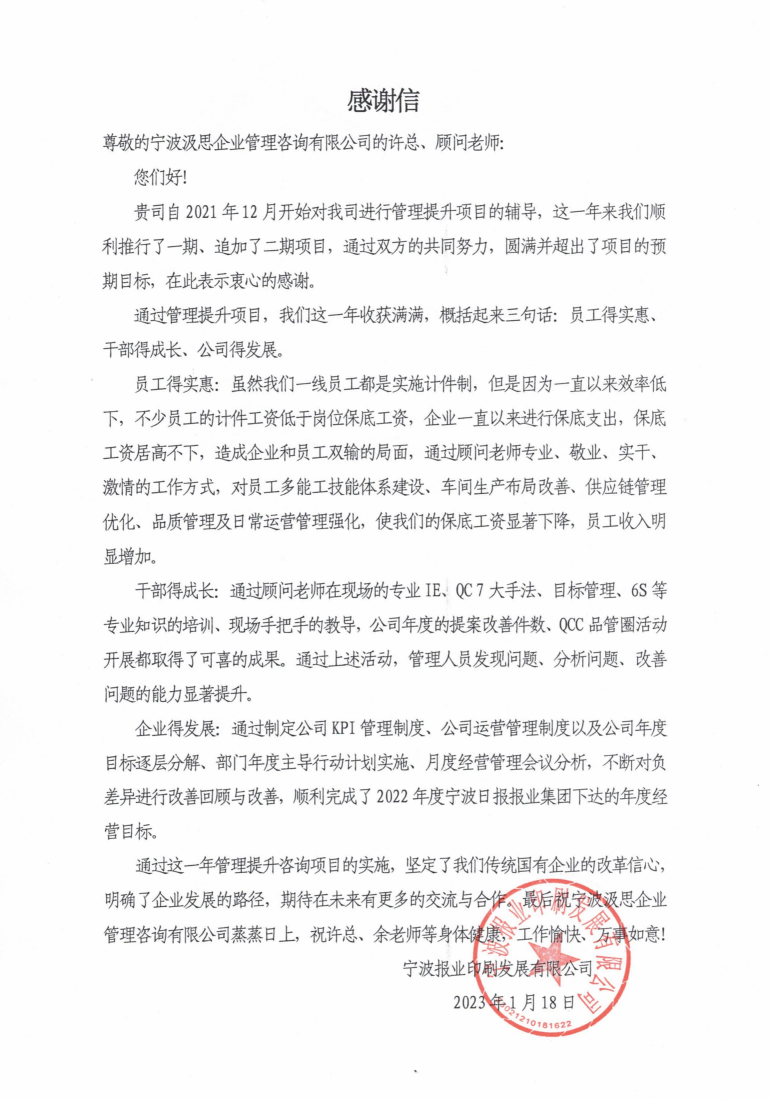 宁波报业印刷感谢信