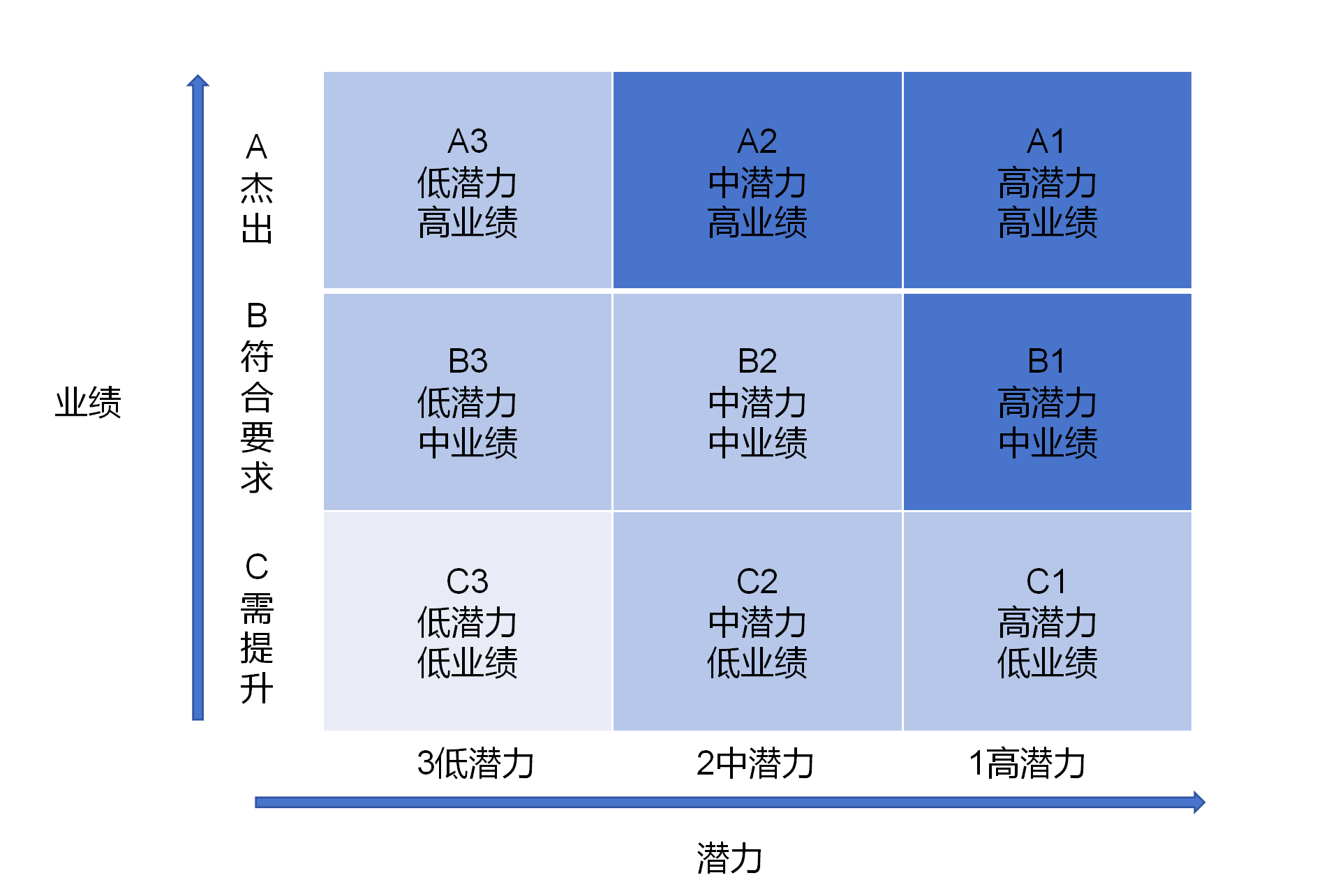 九宫格通常由两向坐标轴组成,这就提供了看人的两种维度,比单一对人才进行排序提供了更多的信息。每个维度被切分成三份,将人才的特点做了归类。最终交叉出九个格子,每个格子代表人才一定的特点,也有相应的管理建议和发展策略。比如:根据业绩和潜力两个维度,将人才分成九个区域,如下图:一般处于A1、A2、B1三个区域的员工为重点培养对象,这就是人才盘点后的应用计划了。