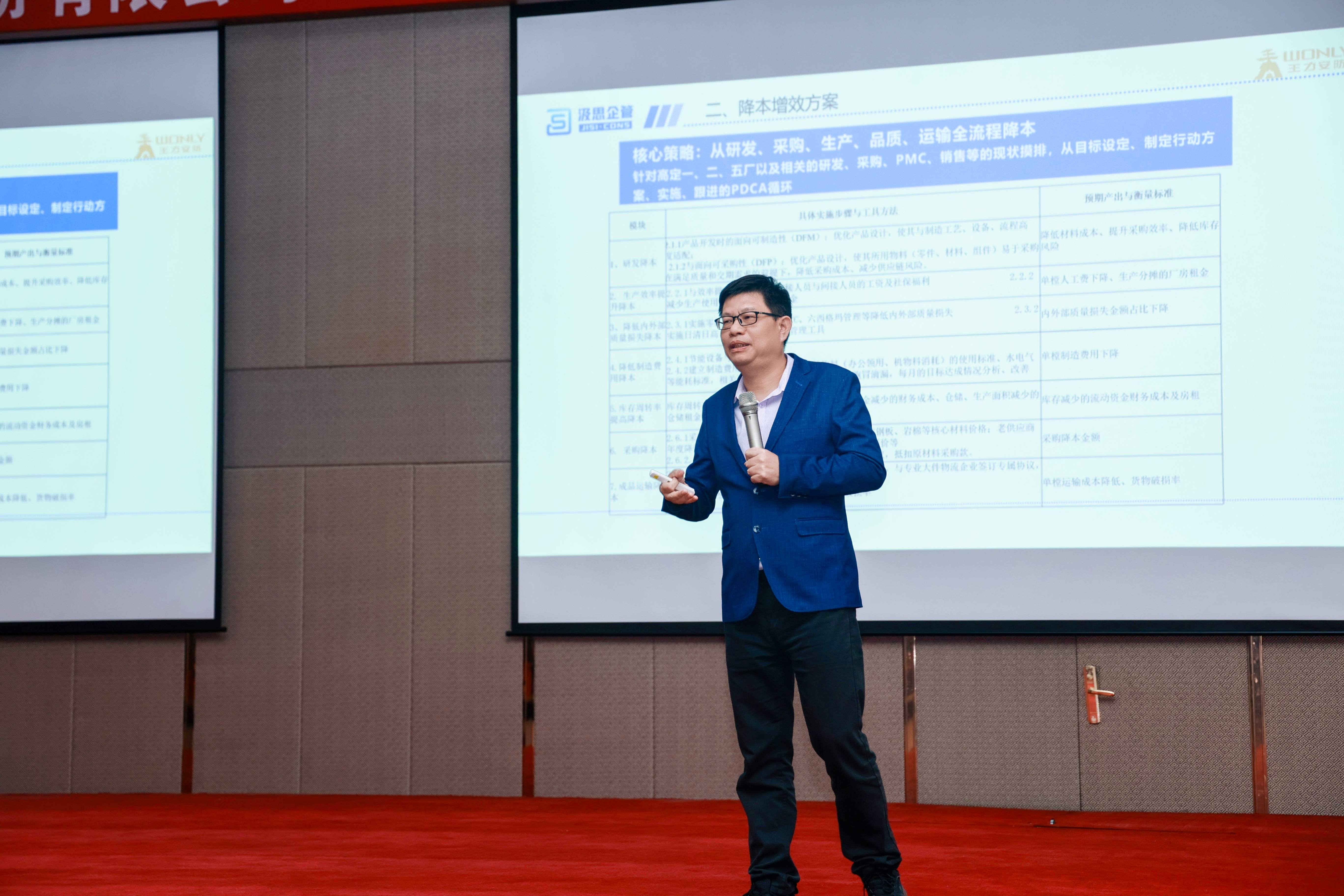 启动会现场,汲思企管吴老师首先分享前期诊断成果:既点明基地生产流程短板,又拆解精益方法论核心逻辑,还通过过往成功案例,以真实成效展现精益价值,进一步坚定项目团队变革信心。随后,他明确本次项目六大目标:提高人均工效、降低成本、缩短制造周期缩短与提高准交率、提高工序直通率与降低返修率、打造“可参观型”5S工厂和构建精益人才梯队。